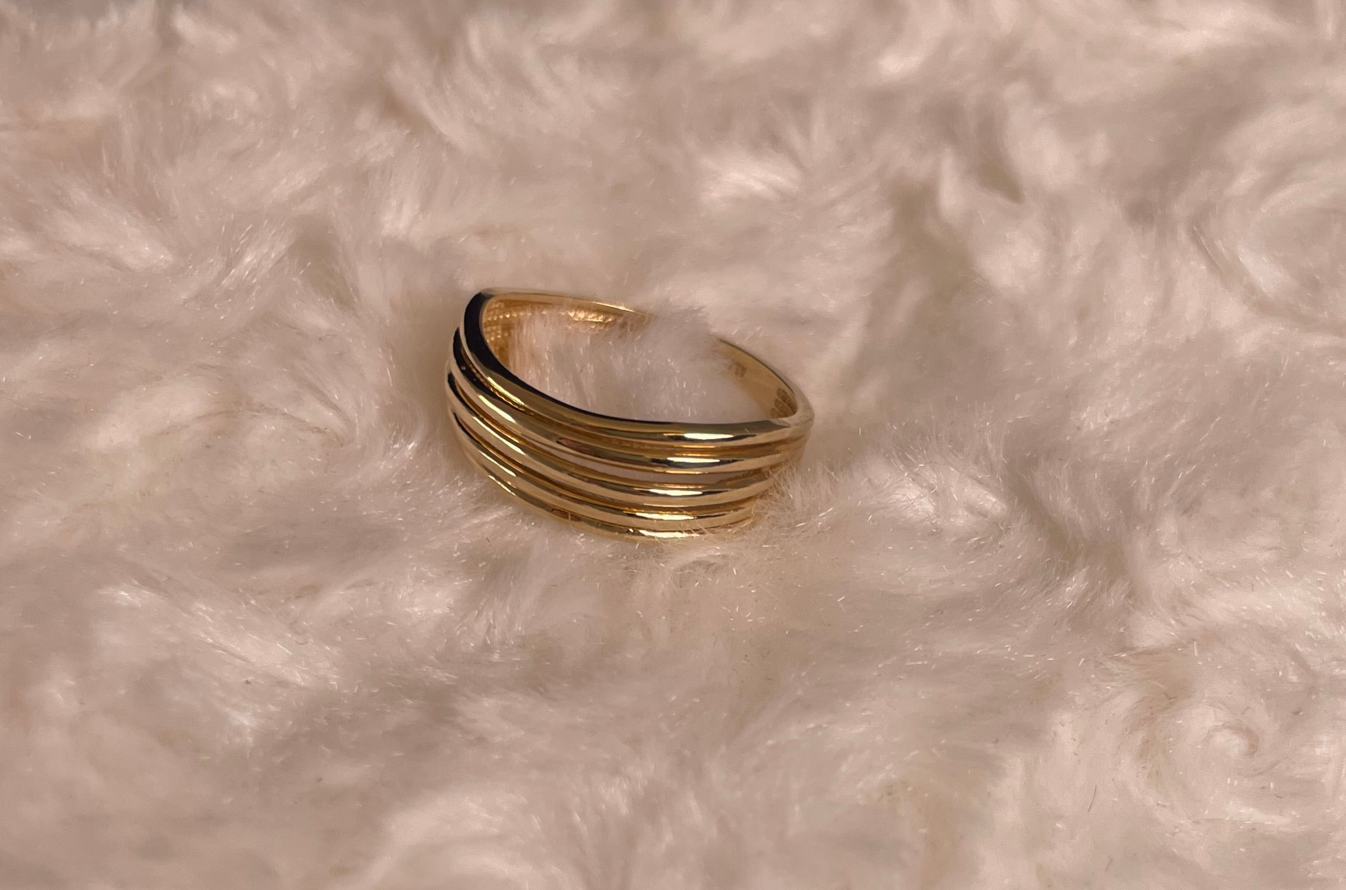 Introducing a delightfully wavy five-row wonder in 14ct yellow gold! This tapered band ring brings a touch of movement and dimension to your finger with its gently undulating design. Weighing approximately 2.7g and crafted in a size P ½ (roughly 7mm wide), it's the perfect balance of presence and elegance. A playful twist on the classic band ring that catches the light beautifully from every angle.