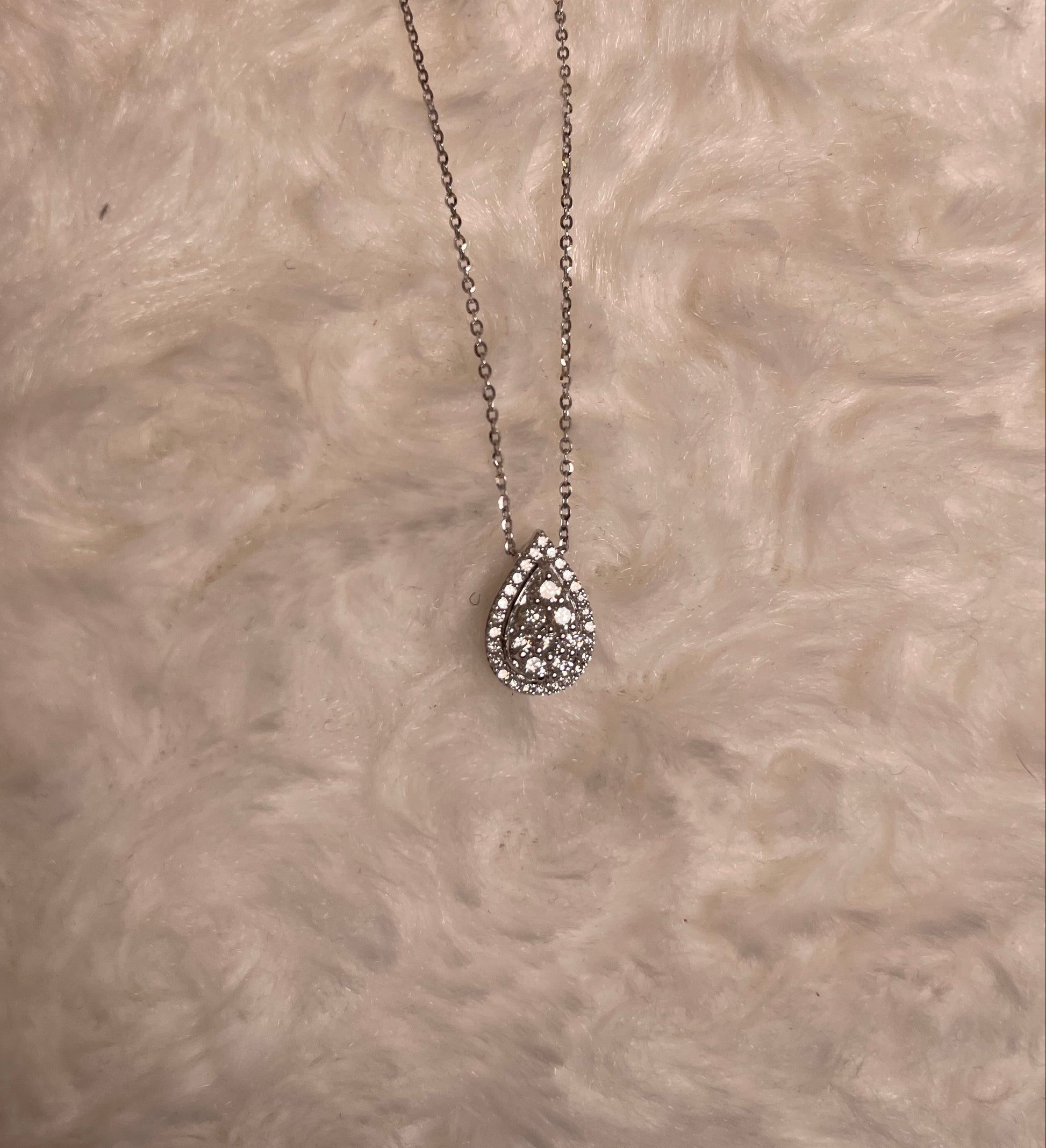 This radiant 18ct white gold pendant is pure magic wrapped in elegance. The enchanting pear silhouette showcases a two-tier pave diamond setting that sparkles from every angle, featuring 0.35ct of brilliant diamonds. Glide the pendant along your choice of 16" or 18" fine 18ct white gold chain—weighing just 2.3g, it's the perfect companion for everyday glamour or special occasions. A jewel that proves luxury truly is in the details.