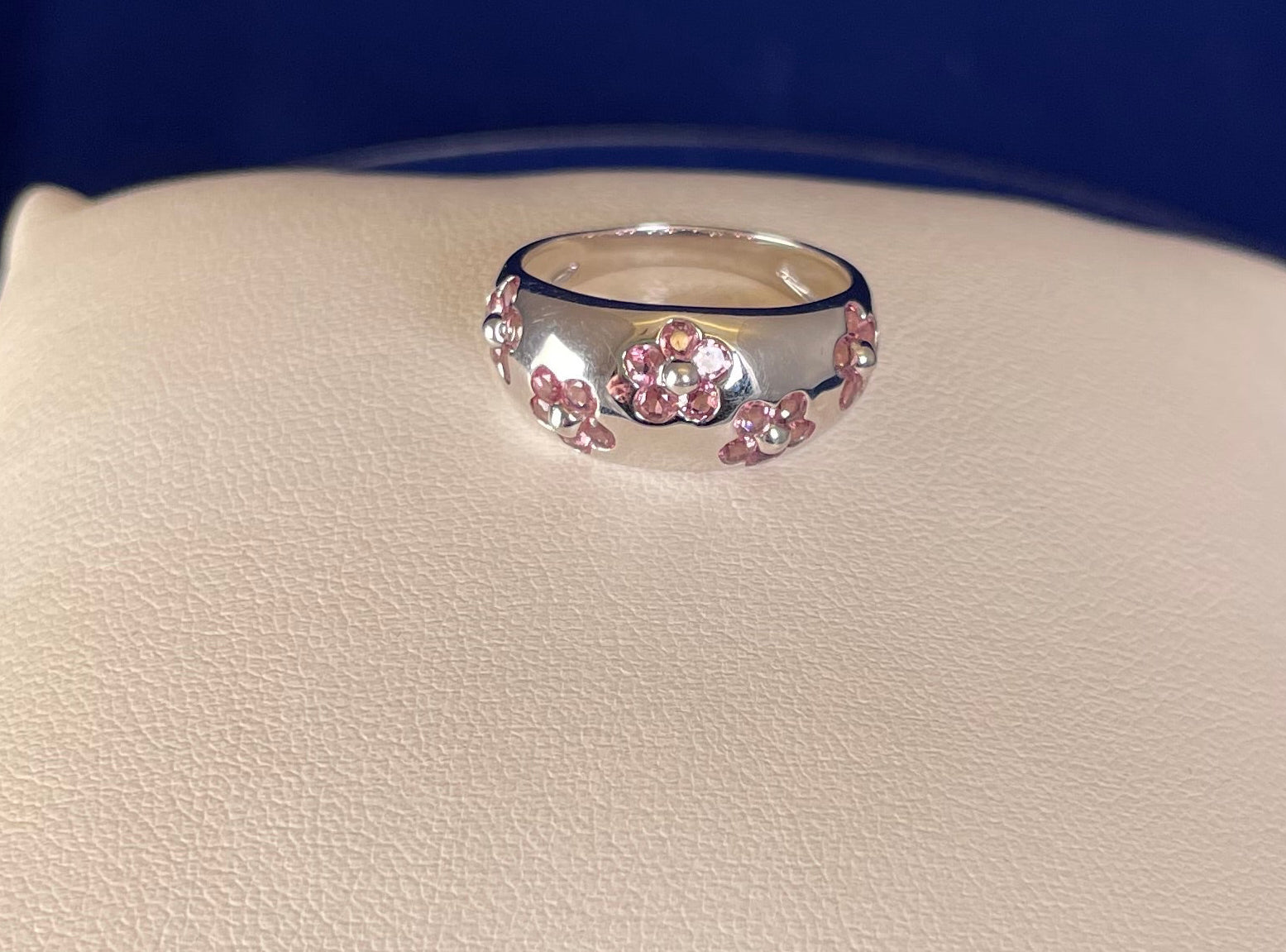 Picture five delicate pink sapphire blossoms dancing across your finger in this charming 9ct white gold dress ring. The softly domed silhouette cradles each flower cluster with elegant grace, creating a garden-inspired design that's both whimsical and refined. Weighing approximately 3.9g and sized N, this piece brings a touch of botanical romance to any occasion.