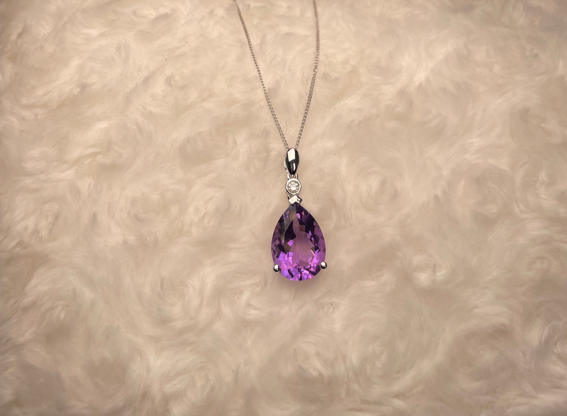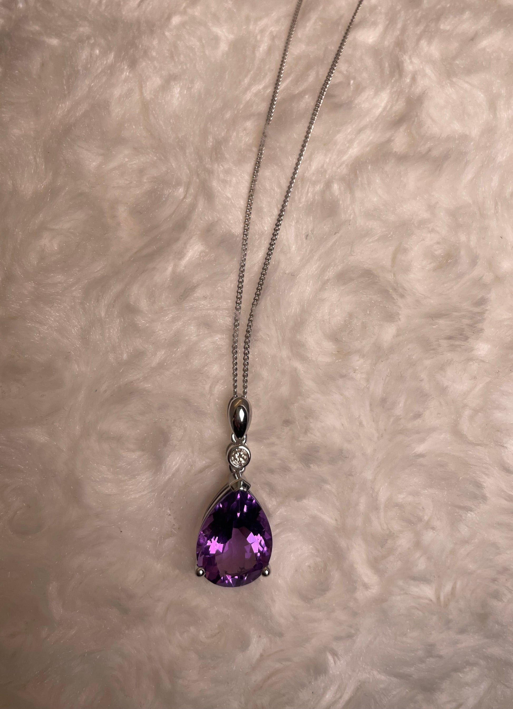 9ct White Gold Pear Shape Amethyst + One Diamond Pendant Necklace