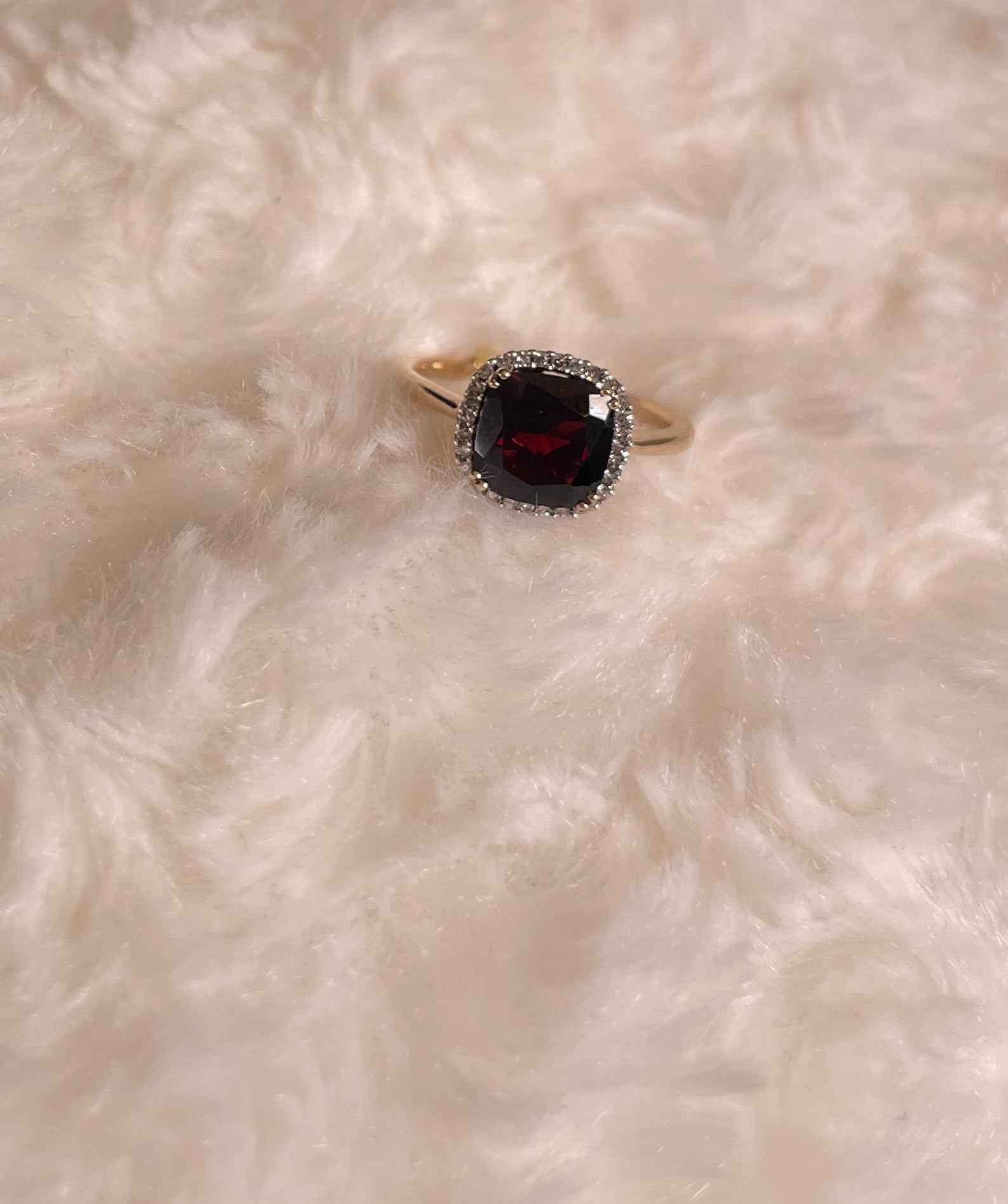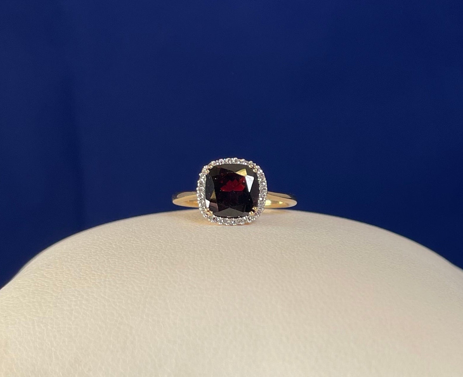 Crafted in lustrous 9ct yellow gold, this charming ring features a gorgeous cushion-cut garnet as its showstopper, playfully framed by a sparkling cluster of diamond chips. Weighing approximately 3g and sized at M, this beauty showcases a 7.5mm garnet and 0.10ct of diamonds that catch the light with every gesture. Perfect for adding a pop of colour and sparkle to your everyday style.
