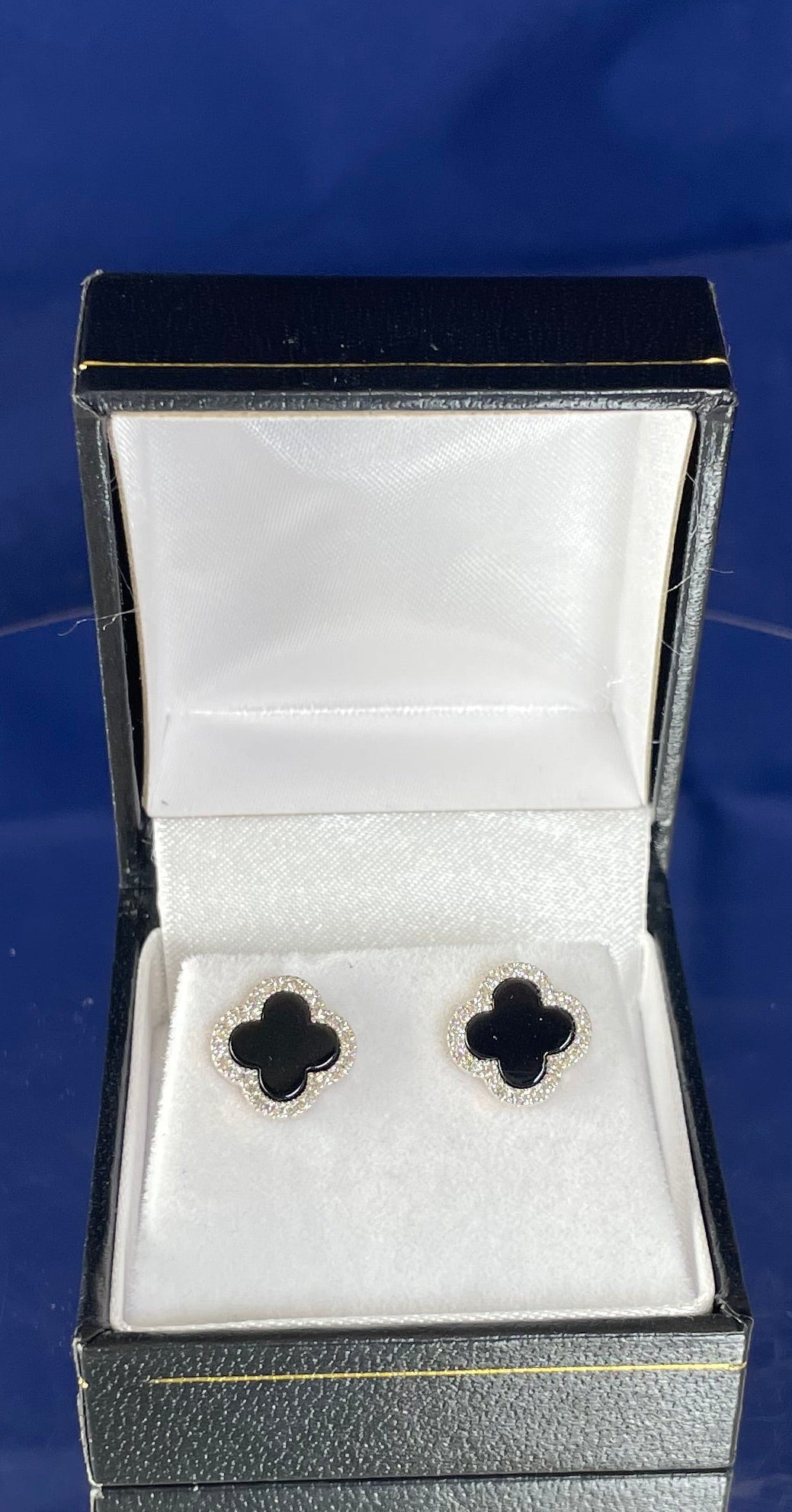 9ct Yellow Gold Onyx & Diamond Clover Earrings