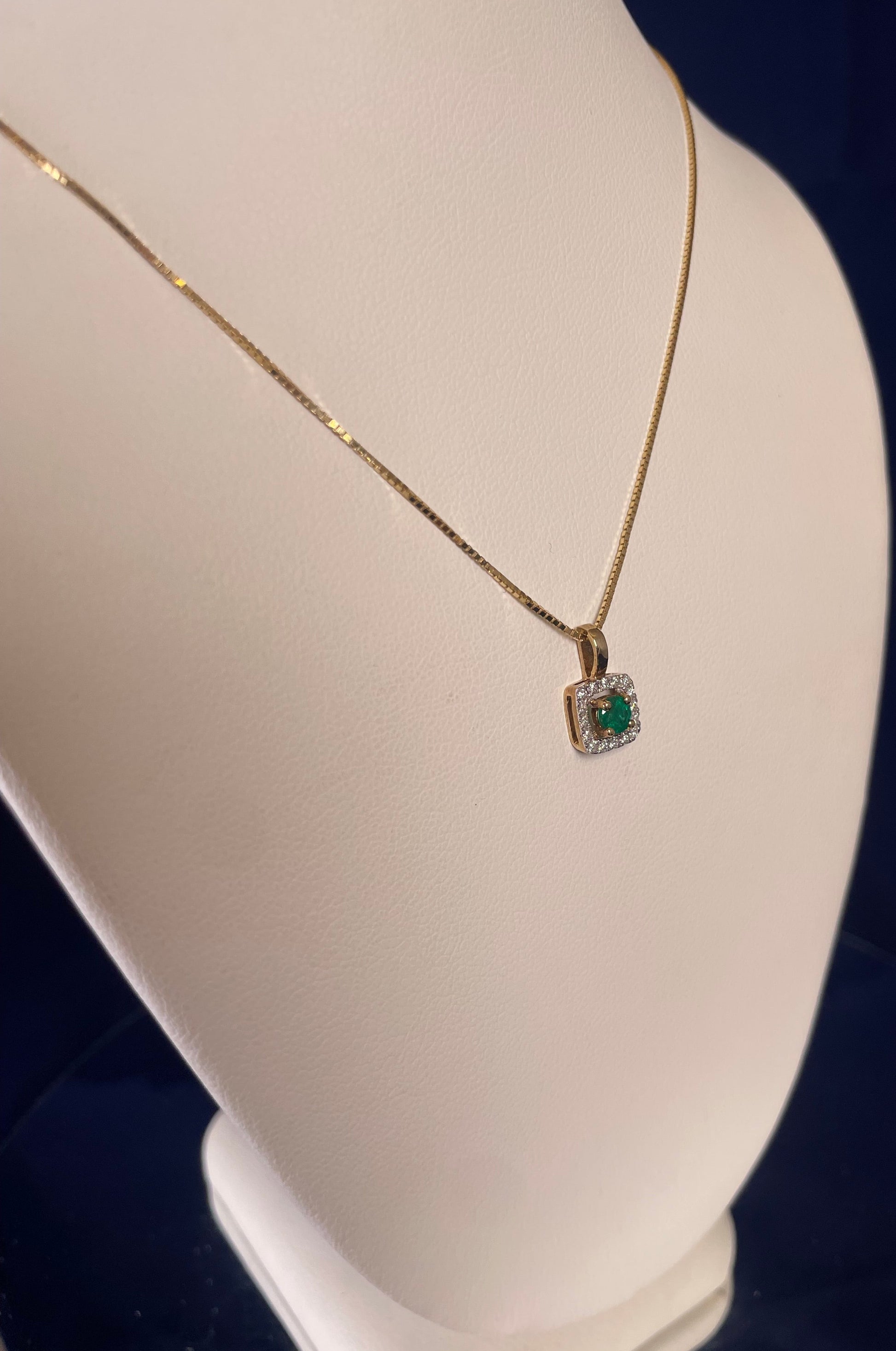 Emerald dreams meet diamond sparkle in this charming 9ct yellow gold pendant. A lustrous round emerald takes centre stage, framed by a two-tier cushion-shaped diamond cluster that adds serious shimmer without the serious attitude. Dangling from an 18" fine box chain, this petite beauty weighs just 2.1 grams and measures 11.2x11.2mm across its outer tier—proof that good things really do come in smaller packages. A playful nod to classic elegance with a wink of colour.