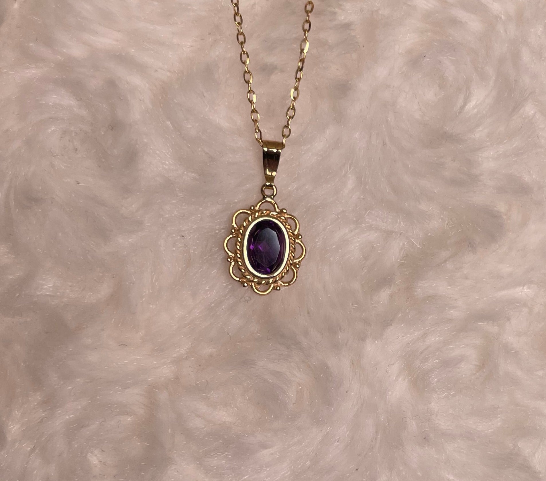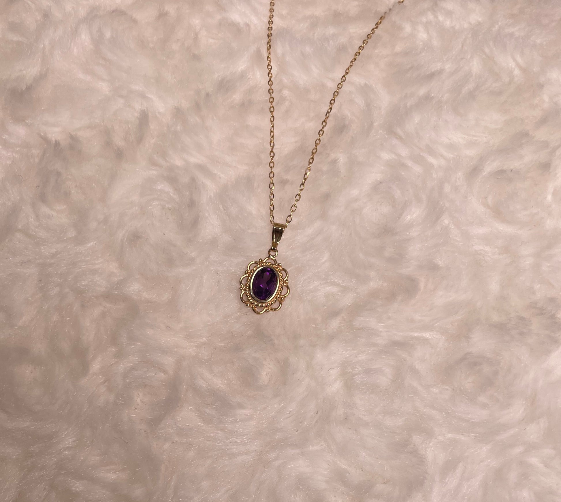 9ct Yellow Gold Rubover Set Oval Amethyst with Filigree Surround Pendant Necklace