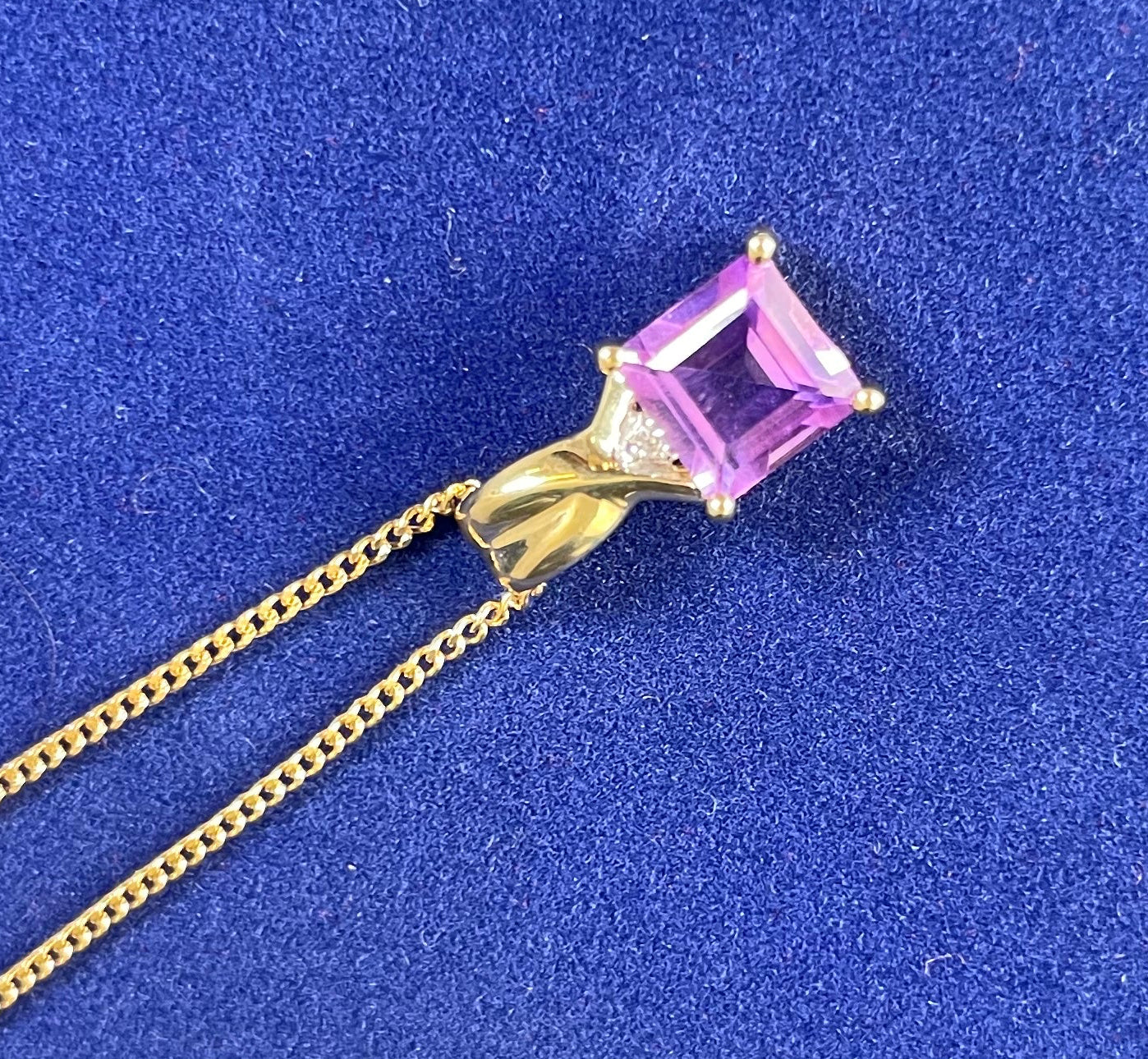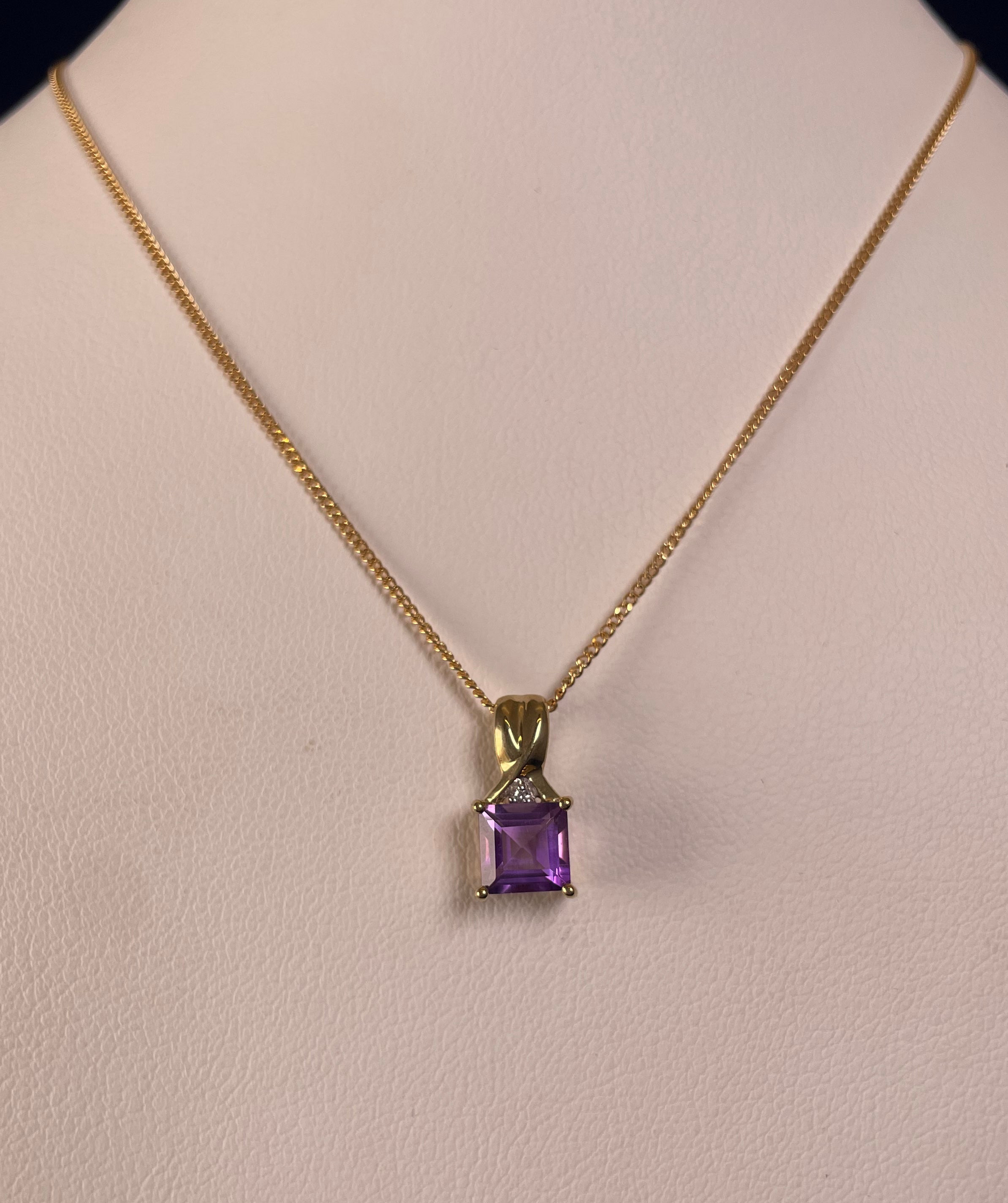 9ct Yellow Gold Square Amethyst with Diamond Chip Pendant Necklace