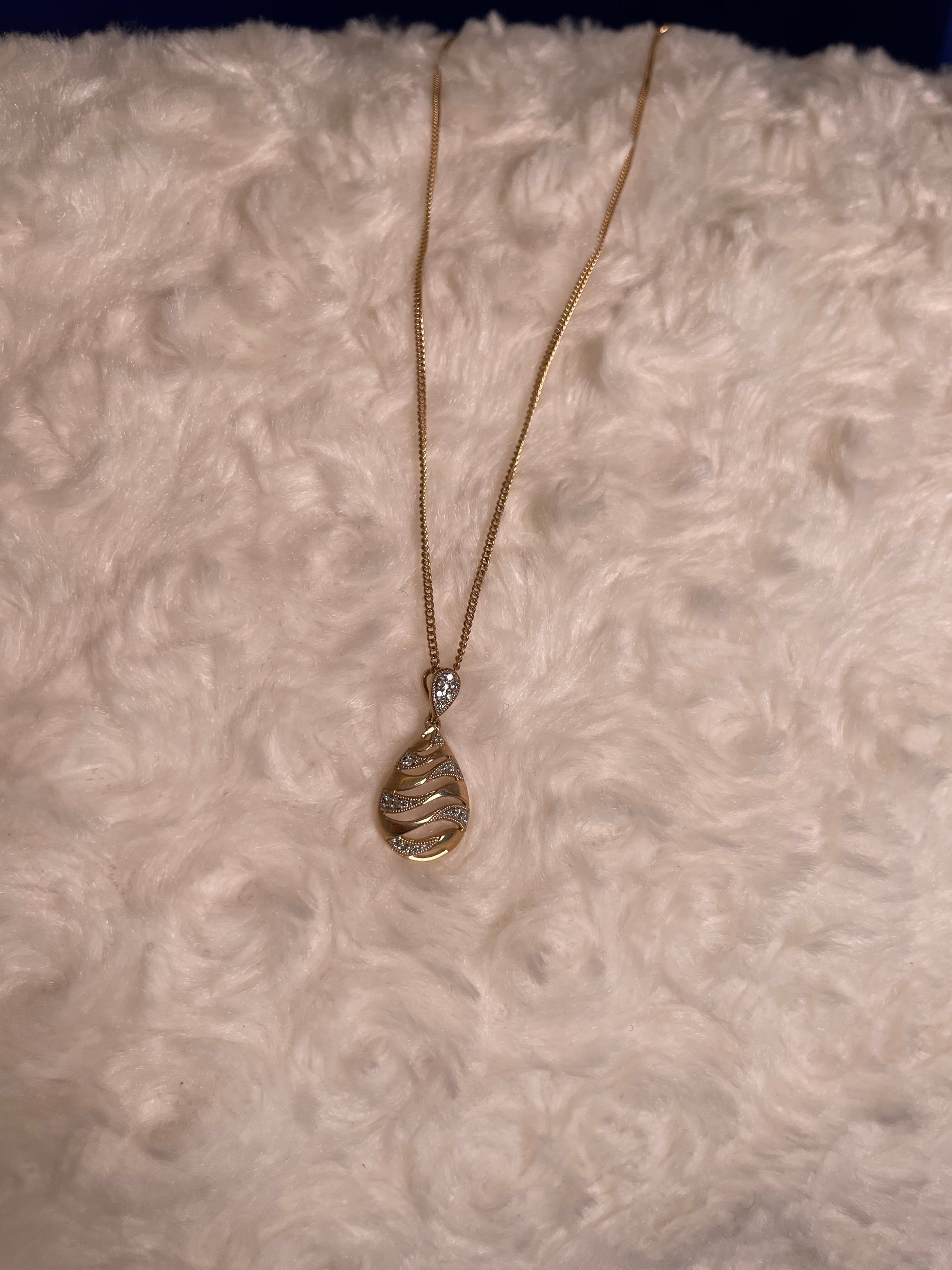 Elegantly crafted in 9ct yellow gold, this teardrop pendant features an intricate lattice design adorned with a sparkling diamond. Suspended from a delicate 16" curb chain, the pendant weighs approximately 1.3g and measures 23mm including the bale, while the chain itself tips the scales at around 1.9g. A timeless piece that catches the light beautifully.