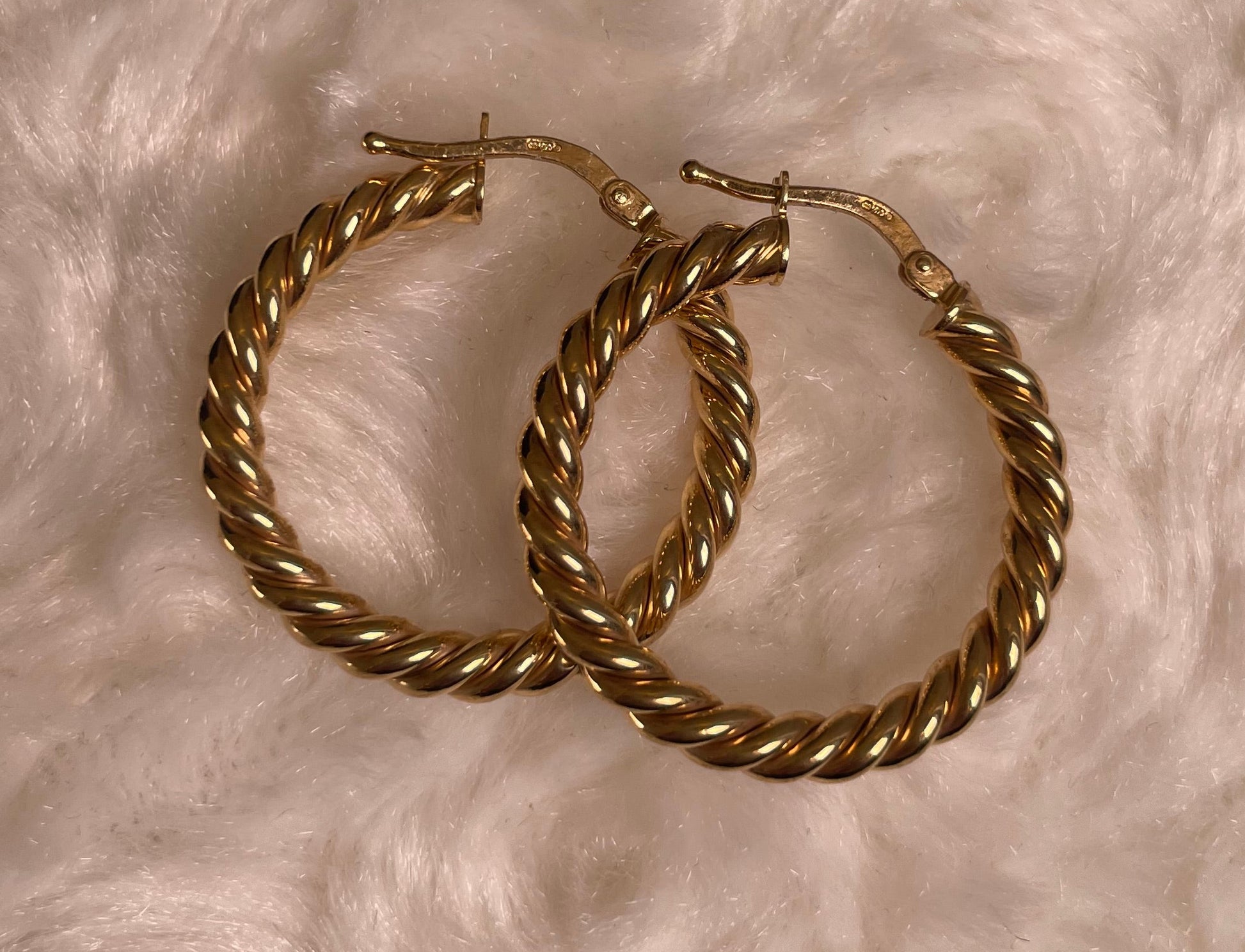 Elevate your everyday look with these charming 9ct yellow gold hoops that feature a delightful twisted design. Lightweight at just 2g, they're comfortable enough for all-day wear, while the secure hinged closure keeps them perfectly in place. With a 26mm diameter and 3.05mm width, they strike the ideal balance between statement-making and wearable elegance. A timeless piece that adds a touch of sparkle to any occasion.