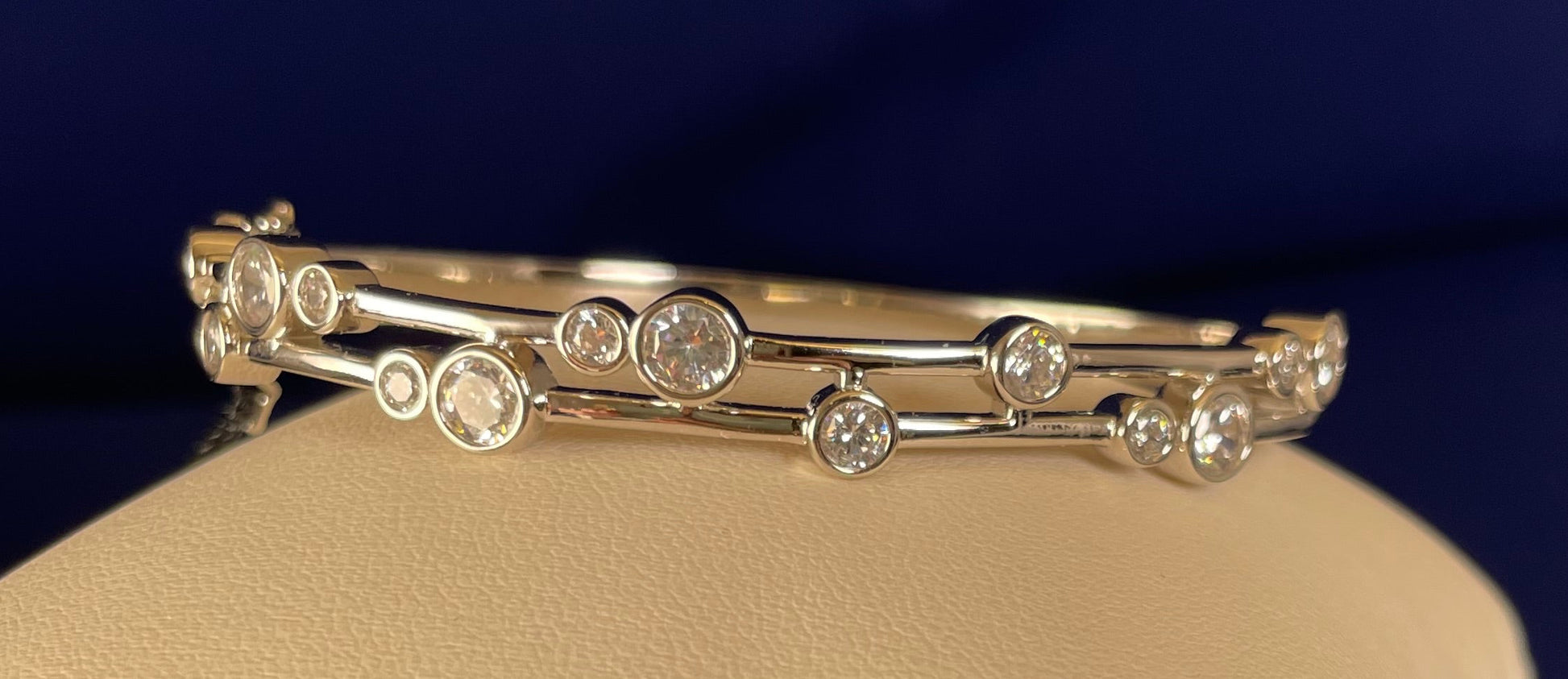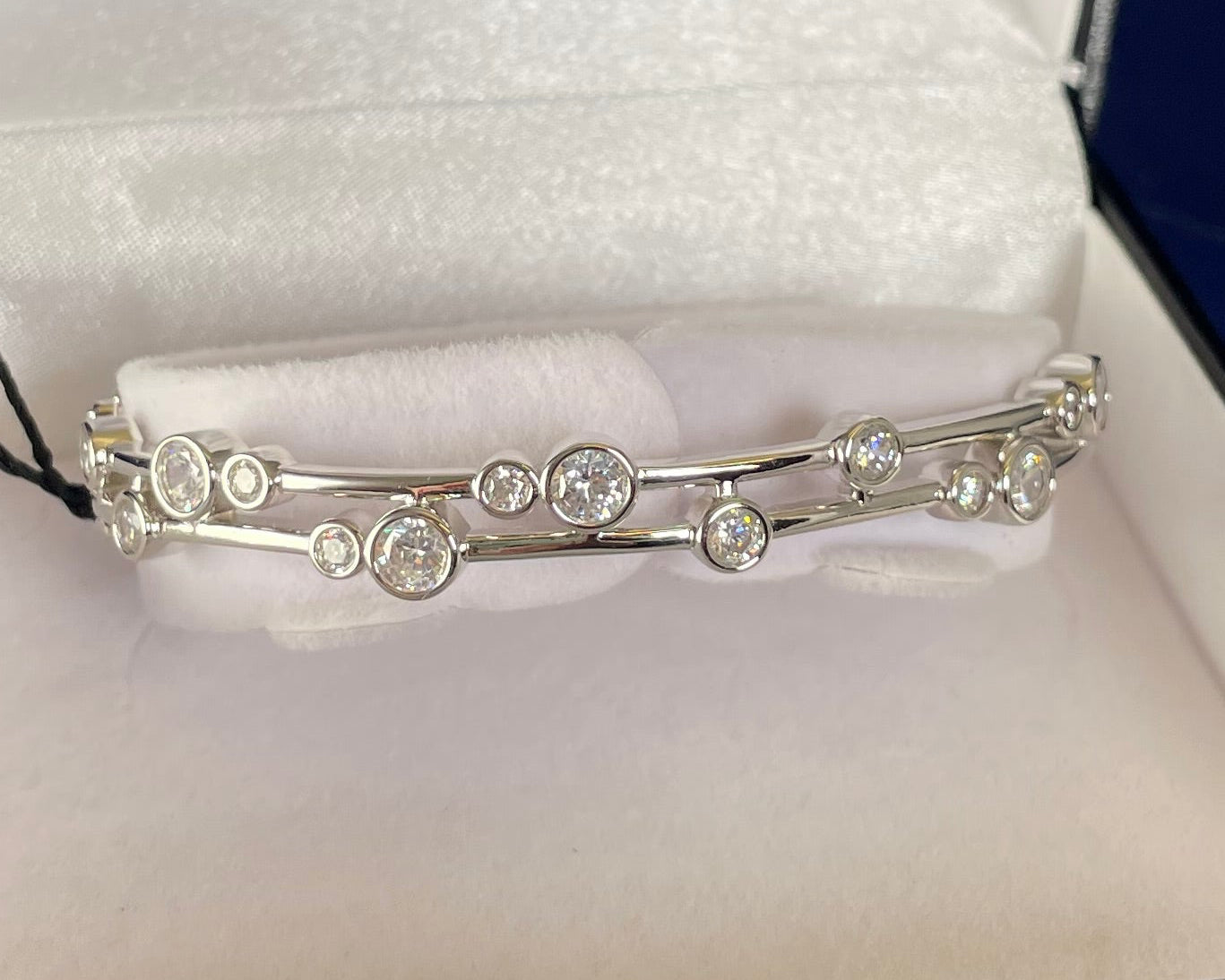 Dual-row boodle design meets sparkle in this rhodium-plated silver hinged bangle. Cubic zirconias catch the light beautifully, while the clever two-tier construction adds dimension to your wrist stack. Weighing approximately 2.1g, it's got the presence of fine jewellery without the fuss. A playful twist on classic elegance.