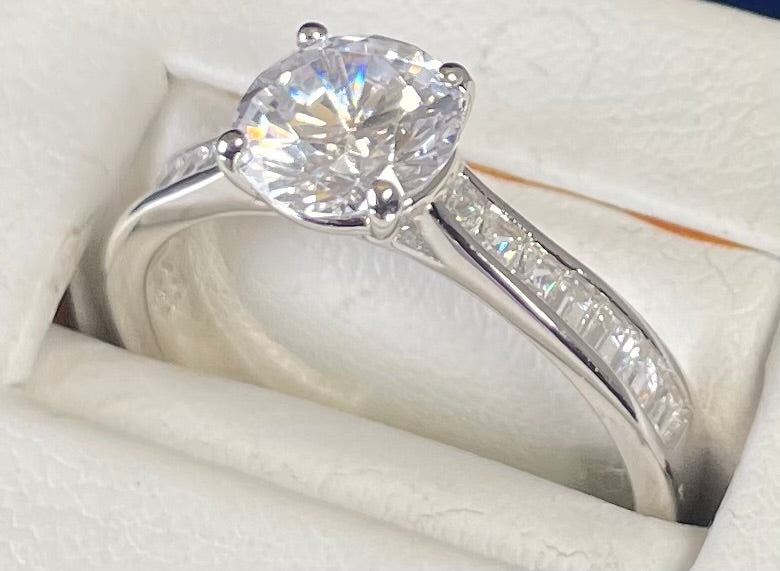 Brilliant Cut Cubic Zirconia Solitaire With Baguette CZ on Shoulder Rhodium Plated