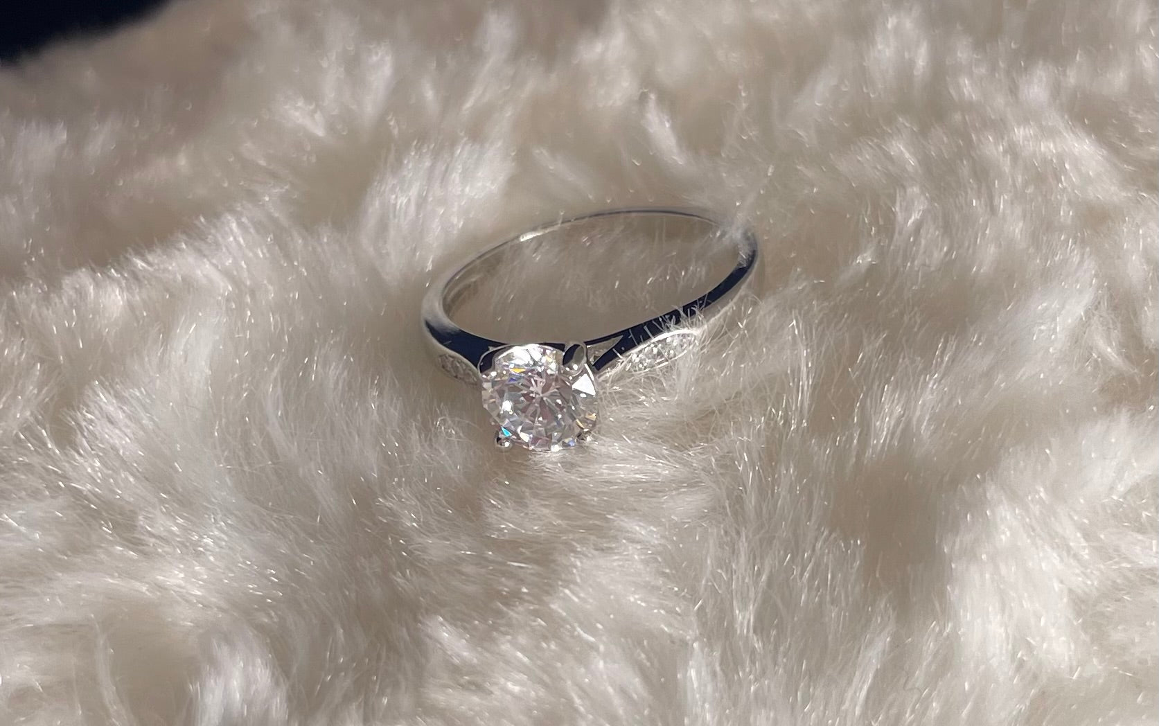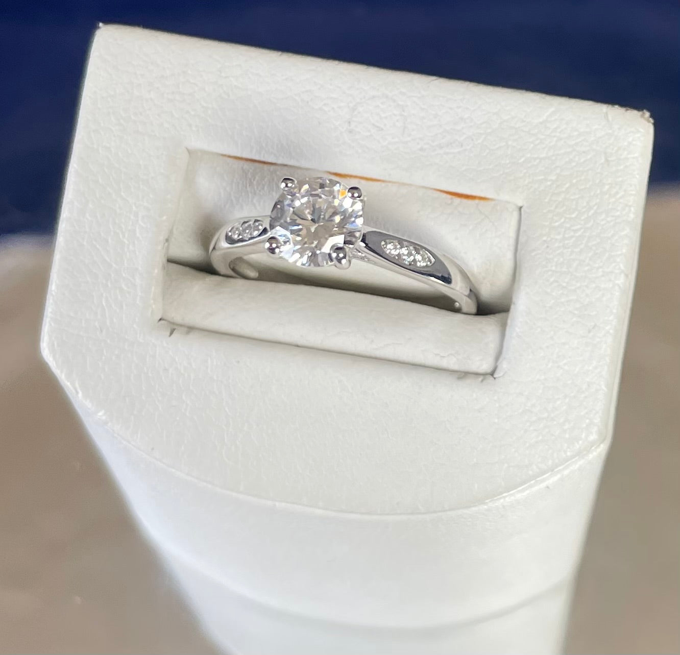 Catch the light from every angle with this sparkling solitaire—a brilliant-cut cubic zirconia centerpiece held securely in a four-claw setting, flanked by delicate round stones along the shoulder. Rhodium-plated for lasting luster, this beauty weighs 2.21g and fits a size L finger. Pure sparkle, zero compromise.