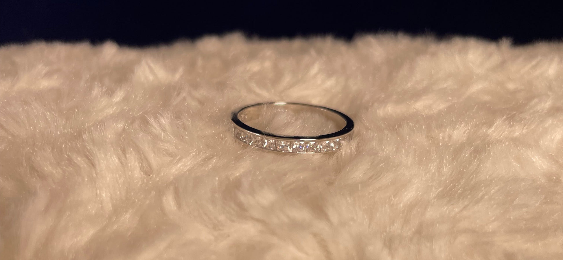 Get ready to turn heads with this joyfully glamorous half eternity ring. Boasting a brilliant channel of princess-cut cubic zirconia stones wrapped in rhodium plating for a mirror-like finish, it's the kind of ring that makes you smile every time you catch it in the light. Weighing 2.18 carats in size N, it's proof that you don't need to compromise on sparkle or fun. Pure joy on your finger.