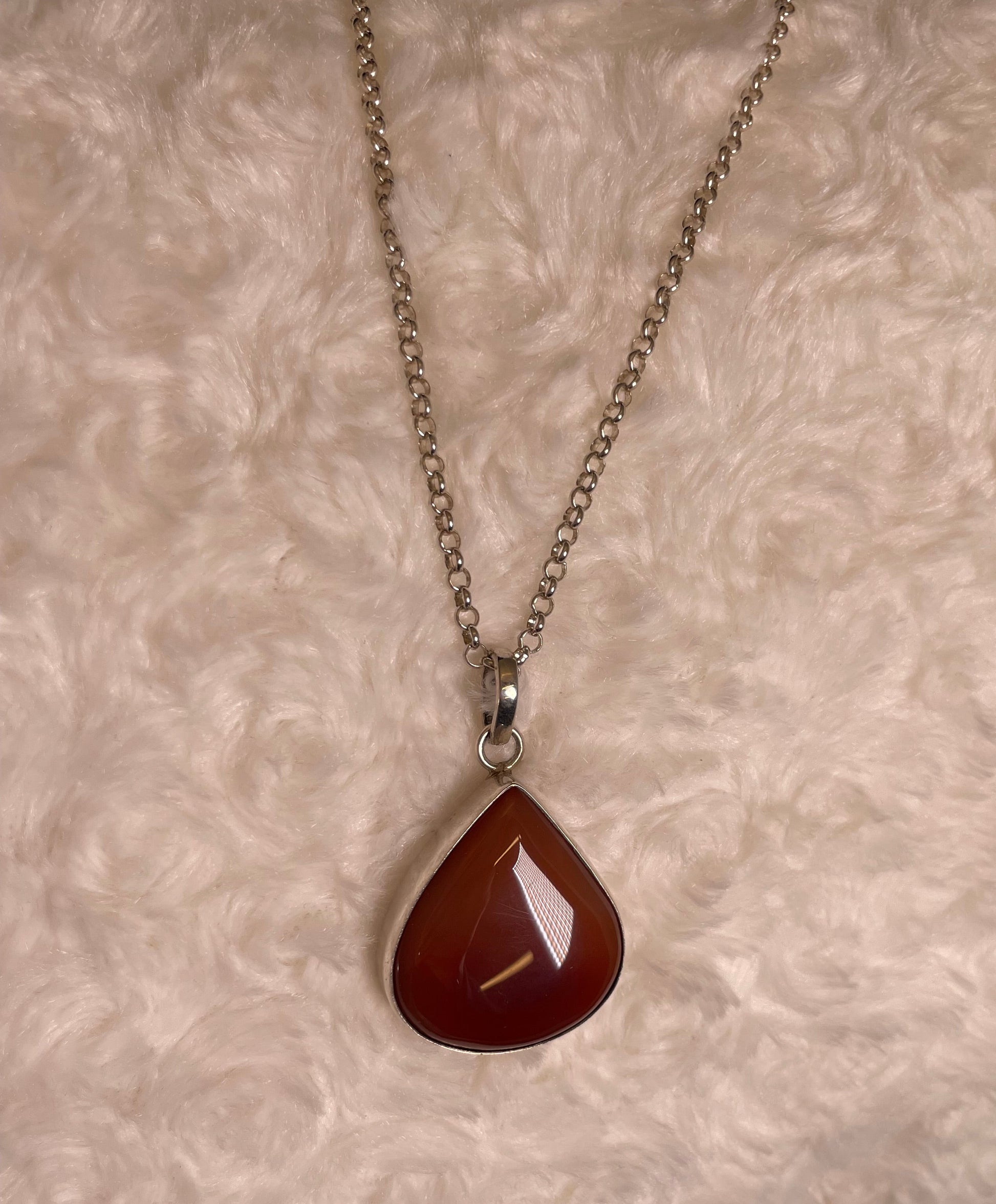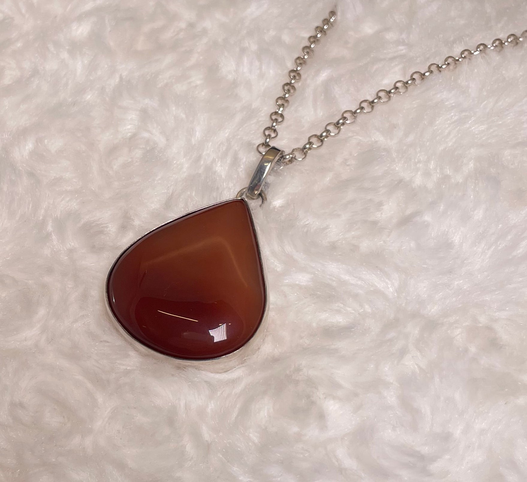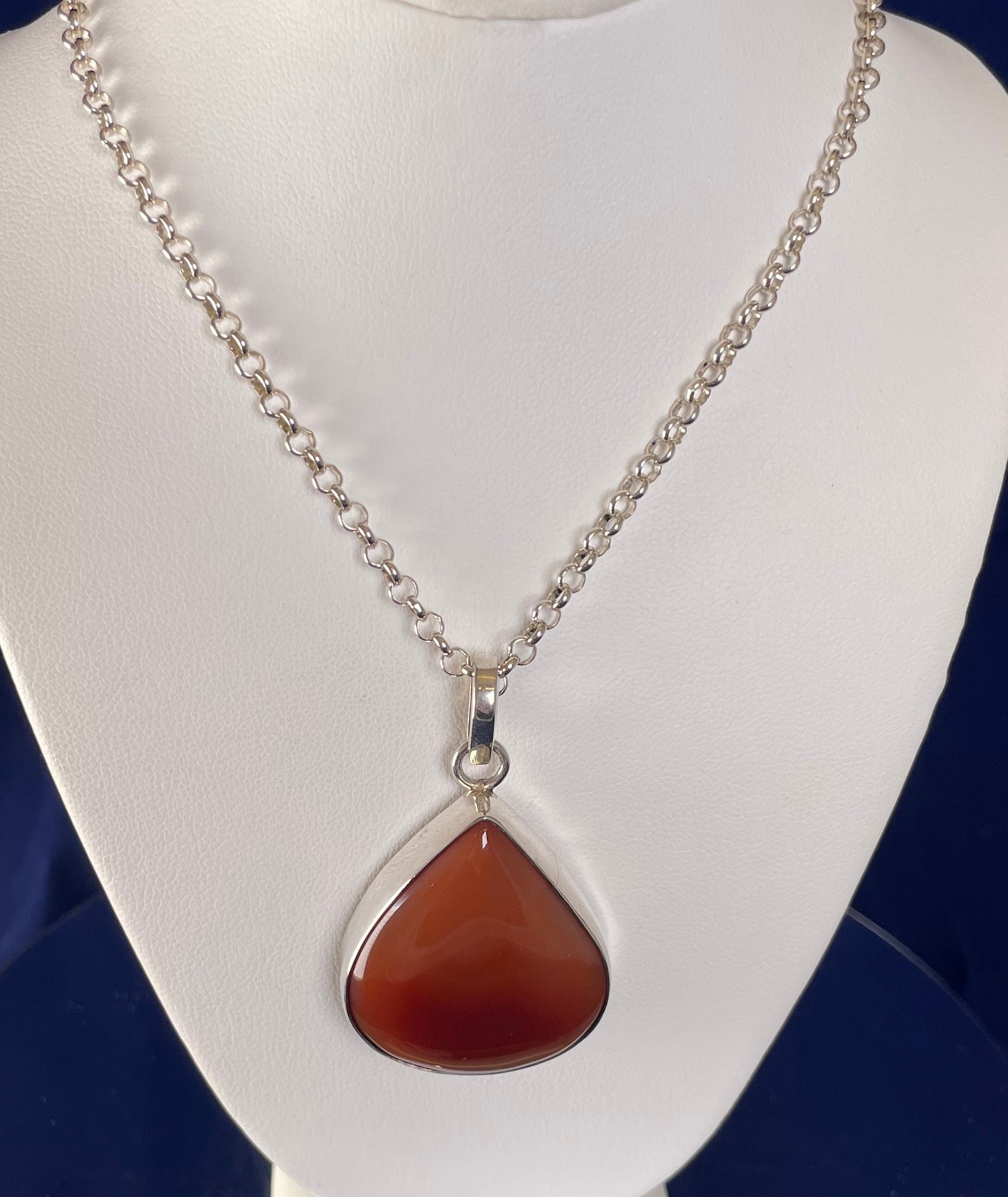 This stunning pear-shaped cornelian pendant brings warmth and character to any collection. Crafted in silver and suspended from a classic 22-inch round belcher chain, the rich amber tones of the cornelian stone catch the light beautifully. At 35.2x30.7mm, it's generously sized without being overwhelming—the perfect statement piece for layering or wearing solo. A timeless accessory that feels both elegant and effortlessly cool.