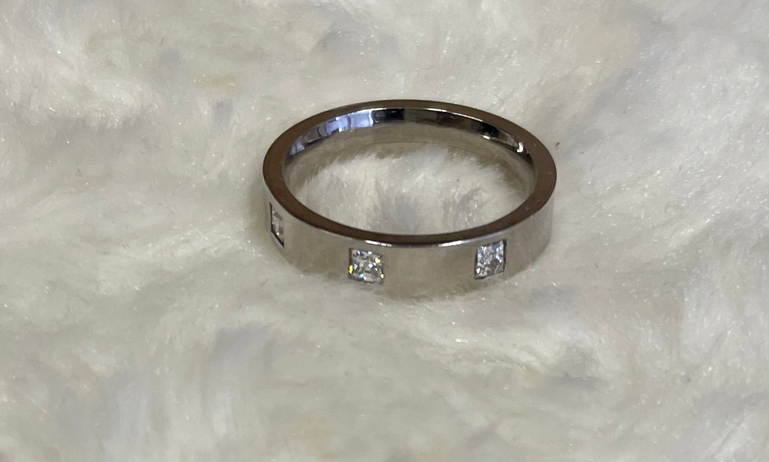 This Flat Court band is decked out with three sparkling Princess Cut Cubic Zirconias, plated with Rhodium and weighing in at around 5.1g. It's a Size O with a diameter of 4.3mm. How dazzling!
