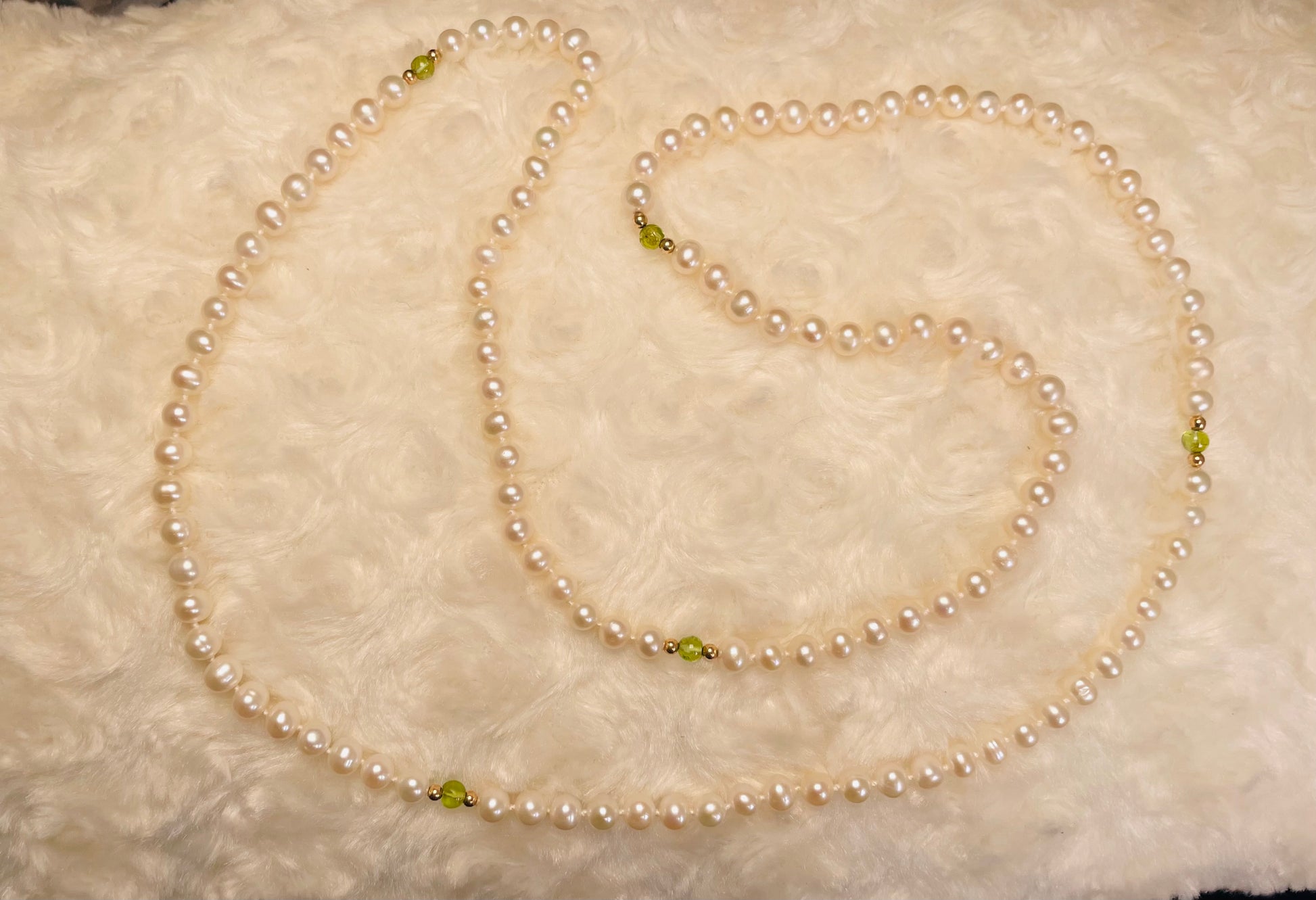 Prepare to turn heads with this effortlessly chic necklace featuring a single strand of lustrous freshwater cultured pearls, punctuated by vibrant peridot gemstones and gleaming gold accents. Five stunning peridots and ten delicate gold beads are thoughtfully knotted throughout, creating a piece that's equal parts sophisticated and fun. The clasp-free design drapes beautifully at approximately 36 inches, making it the perfect statement piece for those who appreciate timeless elegance with a playful twist.
